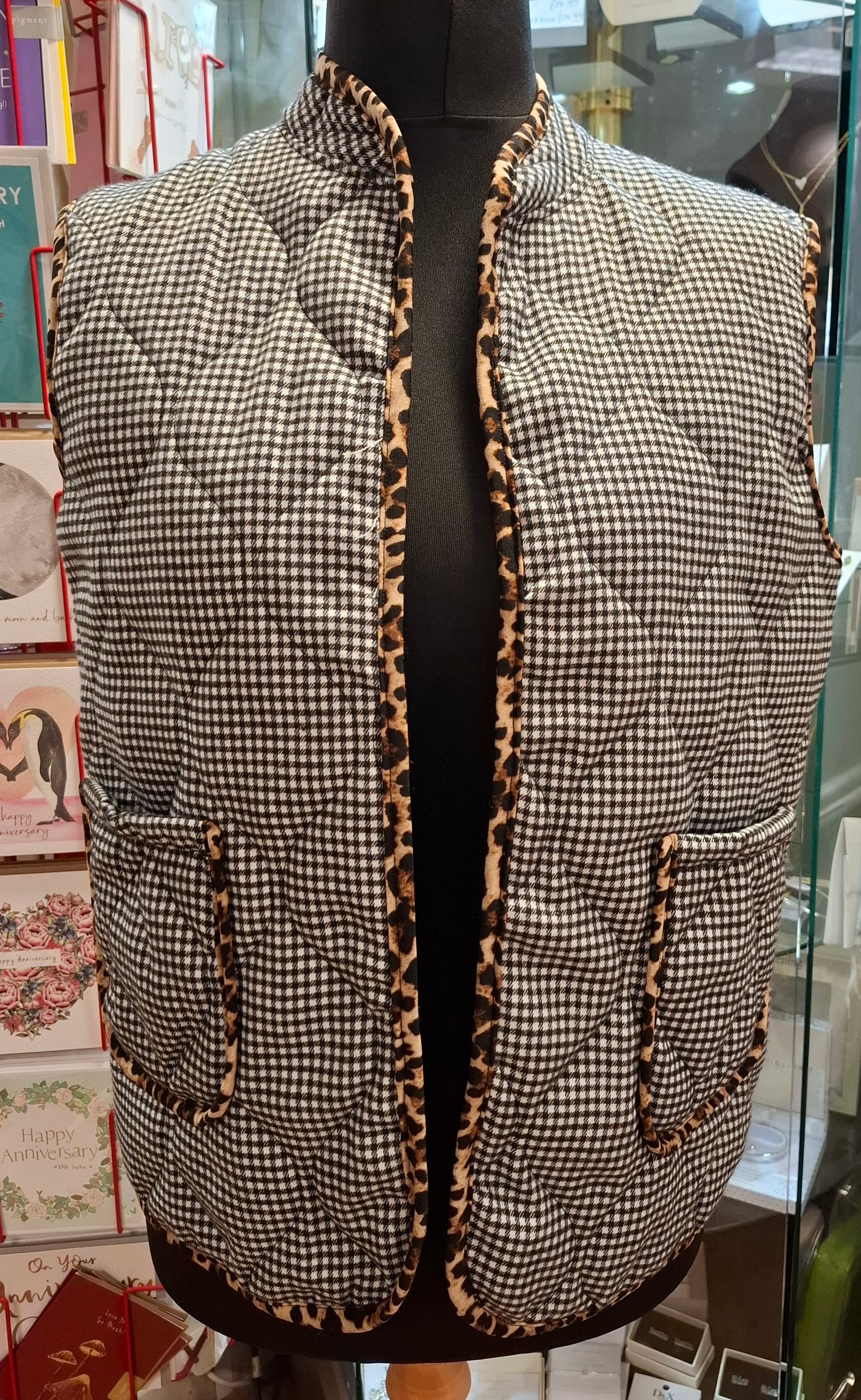 Dogtooth Check Quilted Gilet Leopard Print Detail