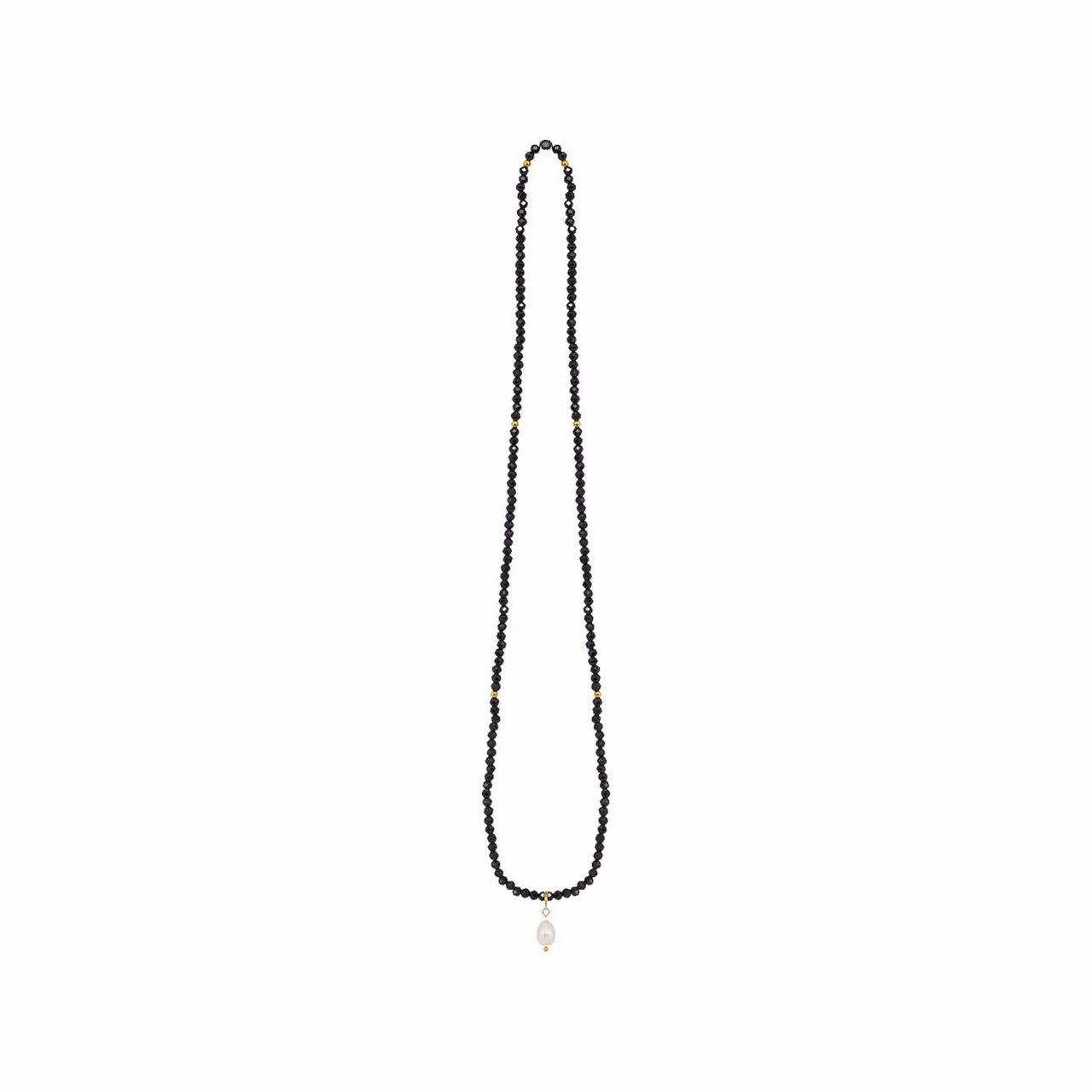 Featuring sleek black crystal beads accented with delicate gold highlights and a luminous pearl pendant, this striking piece adds depth and sophistication to any look.