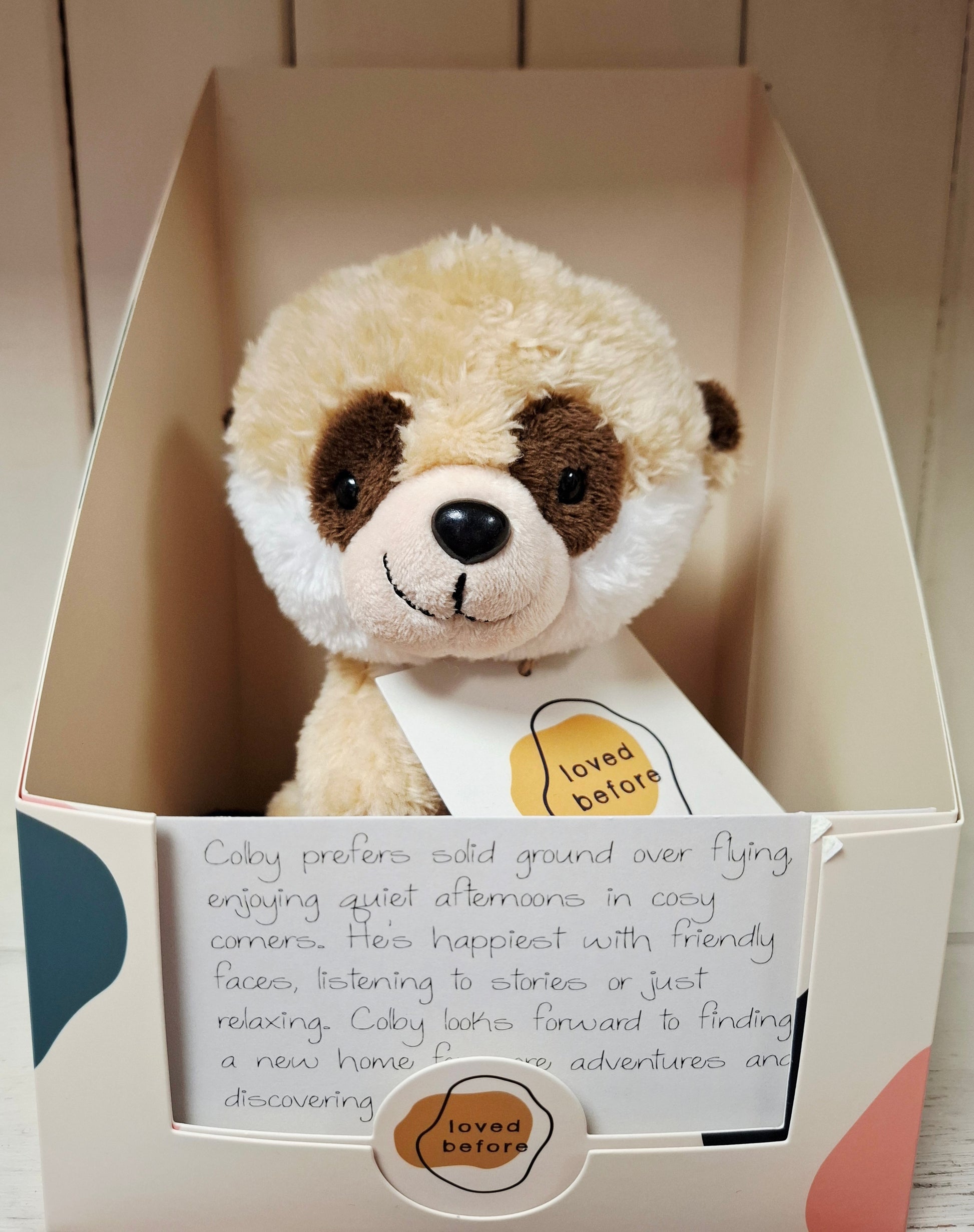 Colby prefers solid ground over flying, enjoying quiet afternoons in cosy corners. He's happiest with friendly faces, listening to stories or just relaxing. Colby looks forward to finding a new home for more adventures and discovering new tales.